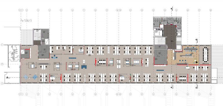 Im Rahmen der Layoutplanung werden die Vorgaben des SmartWork-Konzepts von BOSCH für insgesamt 130 Mitarbeiter umgesetzt. Jedes Geschoss bietet eine Lounge sowie unterschiedliche Angebote zur Zusammenarbeit an.